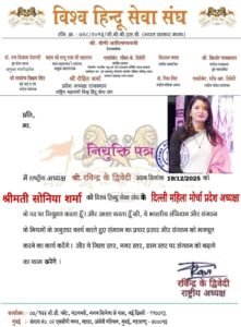 मधुहीर राजस्थाननई दिल्ली। विश्व हिंदू सेवा संघ ने संगठन को और अधिक सशक्त बनाने की दिशा में एक महत्वपूर्ण निर्णय लेते हुए सोनिया शर्मा को विश्व हिंदू सेवा संघ, दिल्ली महिला मोर्चा की प्रदेश अध्यक्ष नियुक्त किया है।