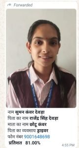 गौरतलब है कि सुमन कंवर ने 10वीं में 79 प्रतिशत और 11वीं में 84 प्रतिशत अंक प्राप्त किये थे, जिस पर स्कूल प्रबन्धन ने उसकी फीस माफ कर दी और नि:शुल्क शिक्षा प्राप्त करते हुए 12वीं बोर्ड परीक्षा में 81 प्रतिशत अंक प्राप्त कर विद्यालय का गौरव बढ़ाया।