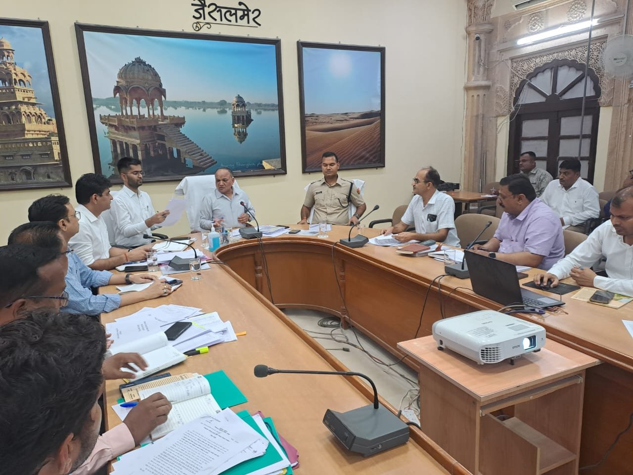 जैसलमेर। संम्भागीय आयुक्त बी.एल. मेहरा ने भीषण गर्मी को ध्यान में रखते हुए पेयजल एवं विद्युत विभाग के अधिकारियों को सख्त निर्देश दिए कि वे जिले में पेयजल एवं विद्युत आपूर्ति व्यवस्था सुचारु रुप से बनाए रखते हुए लोगों को समय पर पीने का पानी उपलब्ध करायें एवं विद्युत आपूर्ति निर्बाध रहे इस पर विशेष ध्यान दें। उन्होंने पेयजल एवं विद्युत विभाग के अभियंताओं को इस मौसम में विशेष कार्य करने एवं फील्ड में अधिक से अधिक भ्रमण कर समय पर जलापूर्ति व्यवस्था बनाए रखने पर जोर दिया एवं कहा कि जहां कहीं से भी पानी एवं बिजली की समस्या के संबंध में सूचना मिले वहां तत्काल टीम भेज कर आपूर्ति व्यवस्थाएॅं सुचारु कर दें ताकि लोगों को पानी एवं बिजली की समस्या नहीं झेलनी पड़े। संम्भागीय आयुक्त श्री मेहरा ने बुधवार को जिला कलेक्ट्री सभागार जैसलमेर में पानी, बिजली, चिकित्सा, जल जीवन मिशन एवं हीट वेव के सम्बन्ध में आयोजित जिला अधिकारियों की बैठक में यह निर्देश दिए। बैठक में जिला कलक्टर प्रताप सिंह, जिला पुलिस अधीक्षक सुधीर चौधरी, मुख्य कार्यकारी अधिकारी जिला परिषद भागीरथ विश्नोई, युआईटी सचिव जितेन्द्रसिंह नरुका के साथ ही जिला स्तरीय अधिकारी उपस्थित थे।