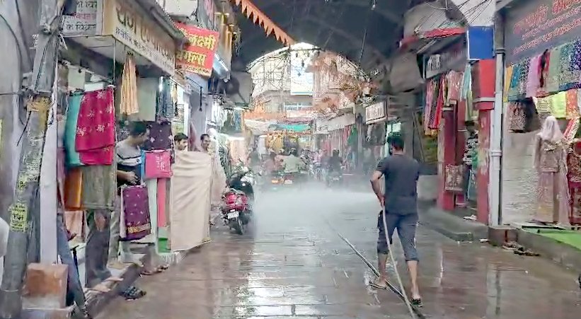 गर्मी बढ़ने के साथ ही लोगों की दिनचर्या प्रभावित होने लगी है, इधर बार बार बिजली कटौती की वजह से लोग बेहाल रहने लगे है। इससे गर्मी के मौसम में लोगों को कई परेशानियों का सामना करना पड़ रहा है। वहीं दूसरी तरफ गर्मी से लोगों को राहत के लिए नगर निगम उत्तर ने सड़कों पर पानी का छिड़काव शुरू कर दिया है। मंगलवार दोपहर नगर निगम उत्तर ने शहर के प्रमुख त्रिपोलिया बाजार की सड़कों पर पानी की बौछार की। गर्मी का असर कम हो सके, इसके लिए पूरे मार्ग की सड़कों पर पानी का छिड़काव किया गया। निगम की गाड़ी ने शहर विभिन्न गलियों में भी पानी का छिड़काव कर गर्मी से आहत लोगों को राहत दिलाने का प्रयास किया।