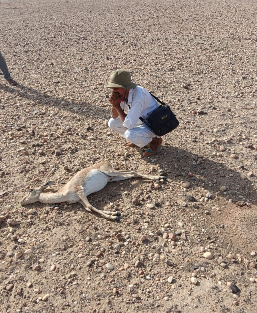 जैसलमेर। जल ही जीवन है सत्य हुआ रविवार सुबह देगराय ओरण के समीप भीखसर सरहद पर मादा हिरण की मौत हो गई। ओरण का तालाब सुखने के पश्चात् इस सप्ताह निरंतर तीसरी मौत हुई है। हिरन प्यास के कारण दर दर भटक कर खत्म हो रहे हैं और श्वानों के शिकार हो जाते हैं। रविवार सुबह हिरण को तड़फता देखकर पशुपालक चुतराराम ने वन्यजीव प्रेमी सुमेरसिंह भाटी सावता को सूचना दी भाटी तुरंत मोके पर पहुंचे थोङी देर में मादा हिरन ने दम तोड दिया। वनविभाग को सुचित करने पर वनविभाग टीम में सुदामाराम मौके पर पहुंचे स्थानीय ग्रामीणों विजयसिंह,लक्ष्मणसिंह, कवराजसिह सोभागसिह के साथ मिलकर मादा हिरण को दफनाया गया। ग्रामीणों ने बताया कि प्रशासन की घोर लापरवाही के कारण अबोले जीव पानी की प्यास की भेंट चढ रहे है।