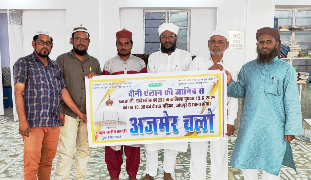 जोधपुर। हिन्दल वली हजरत ख्वाजा गरीब नवाज मोइनुद्दीन चिश्ती अजमेर की छठी शरीफ पर दीनी ऐलान की जानिब से अब्दुल सलीम कादरी के सानिध्य में छठी शरीफ का 222वां काफिला 12 जून, बुधवार रात 10.30 बजे चीरघर मस्जिद, जोधपुर से अजमेर रवाना होगा। काफिले के संचालक अब्दुल सलीम कादरी ने बताया कि काफिले के जायरिनों को मस्जिदों के इमाम मुल्क में अम्नों-शांति की दुआ करवाकर रवाना करेंगे। अब्दुल सलीम ने बताया कि चीरघर मस्जिद इमाम मौलाना नुरूल हसन मिस्बाही, मौलाना अब्दुल गफार कादरी एवं माजिद खान ने 222वें काफिले के बैनर का विमोचन किया। सह-संचालक साजिद परवेज ने कहा कि काफिले के जायरिनों के लिये अजमेर में लंगर का माकूल इन्तेजाम किया गया है। अजमेर में छठी शरीफ की फातिहा के बाद खादिमों के सानिध्य में सभी जायरिन हजरात द्वारा देश की तरक्की, साम्प्रदायिक सद्भाव, हिन्दू-मुस्लिम एकता व कौमी भाईचारे की दुआ का विशेष आयोजन किया जायेगा। यह रहे मौजूद:- अब्दुल सलीम, मौलाना नुरुल हसन, यूसुफ लोहानी (राजा), हैदर अली, साजिद परवेज, राजा मोइन, फरहान खान सहित कई जायरिन हजरात मौजूद रहे।