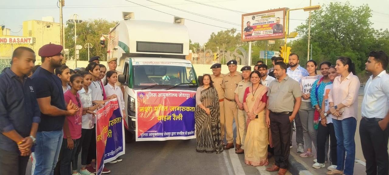 जोधपुर। पुलिस आयुक्तालय जोधपुर द्वारा राजस्थान पुलिस स्थापना दिवस के उपलक्ष में 11 जून शाम 6:00 बजे नशा मुक्ति जागरूकता वाहन रैली का आयोजन किया गया। वाहन रैली पुलिस आयुक्तालय से रवाना होकर शहर के विभिन्न क्षेत्रों में नशा मुक्ति का संदेश देती गुजरी। यह वाहन रैली पांच बत्ती चौराहा पर समाजसेवी बिंदु टाक, युवा समाजसेवी डॉ. मनीष सिंह भाटी, फूडी ट्रैवल के आमिर खान एवं अपराजिता सेवा संस्थान के समीर खान, पुष्टिकर महिला महाविद्यालय की प्रोफेसर पूजा राजपुरोहित के नेतृत्व में महाविद्यालय की छात्राओं ने नशा मुक्ति जागरूकता के लिए नुक्कड़ नाटक की प्रस्तुति दी। डॉ. बिंदु टाक ने अपने उद्बोधन में कहा कि युवाओं को नशे से दूर रहना चाहिए और राष्ट्र के विकास के लिए अपने आप को नशे रूपी अंधकार से बचना चाहिए। कार्यक्रम में पुलिस आयुक्तालय जोधपुर एवं पुलिस प्रशासन की टीम का पौधे देकर स्वागत किया गया एवं जोधपुर पुलिस जिंदाबाद के नारे लगाकर पुलिस का मनोबल बढ़ाने का प्रयास किया गया। इस अवसर पर ब्लैक पैंथर ग्रुप की नितिशा, अक्षय, साहिल और कोमल ने विभिन्न चरित्रों की मिमिक्री कर नशा मुक्ति जागरूकता का संदेश दिया। कार्यक्रम में गीतिका, प्रवीण, रामेश्वर, मनीष चौधरी, सौरभ गहलोत, नितिन, अनुज आदि मौजूद थे।