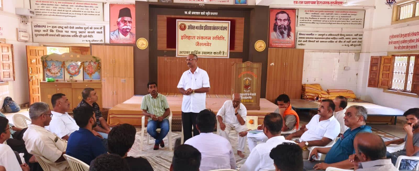 जैसलमेर ( अमित डांगरा )। शहर की गांधी कॉलोनी में स्थित आदर्श विद्या मंदिर के सभागार में इतिहास संकलन समिति जैसलमेर की जिला स्तरीय बैठक को संबोधित करते हुए मुख्य अतिथि तिलोकचंद खत्री ने कहा कि इतिहास लेखन बहुत ही जिम्मेदारी का कार्य है। हमें ऐतिहासिक प्रमाणों व संदर्भो के आधार पर वस्तुनिष्ठ इतिहास लेखन करना चाहिए। उन्होंने आगे कहा कि भारतीय इतिहास की कालगणना विश्व के लिए आश्चर्य और आदर्श है, उसी के अनुरूप इतिहास लेखन होना चाहिए। मुख्य वक्ता केसरसिंह राठौड़ ने कहा कि राष्ट्रीय दृष्टिकोण से इतिहास का पुनर्लेखन होना चाहिए। राष्ट्रीय स्वयंसेवक संघ के आनुषंगिक संगठन के रूप में इतिहास को संजोने का कार्य समिति द्वारा किया जा रहा है, हम सभी इनके सहयोगी बनें। उन्होंने कहा कि इतिहास किसी भी जीवंत राष्ट्र के लिए थाती है, उसके भविष्य के लिए अनिवार्य तत्त्व है। मां सरस्वती के समक्ष दीप प्रज्ज्वलित कर कार्यक्रम का विधिवत आगाज किया गया। अध्यक्ष तनेसिंह सोढा ने भूमिका प्रस्तुत की। सचिव रतनसिंह ने स्थानीय इतिहास लेखन पर प्रकाश डाला। परिचय कार्यक्रम के बाद उपस्थित सभी सदस्यों ने अपने विचार व्यक्त किए। पार्थ जगानी ने शिलालेख संरक्षण पर अपनी वार्ता प्रस्तुत की जिले में स्थित बोनीकी भाषा में लिखित सभी शिलालेखों के समीप हिंदी भाषा में शिलालेख का निर्माण करवा कर लगवाने की आवश्यकता है जिससे युवा हिंदी शिलालेख को पढ कर अपना ज्ञान वर्धन कर सके । बैठक में मुकेश जोशी, नवीनसिंह, तनेरावसिंह, उम्मेदसिंह, डॉ जालमसिंह, तेजपालसिंह, दिलीप माली, हरीश छंगाणी, आभा आदि ने भाग लिया।