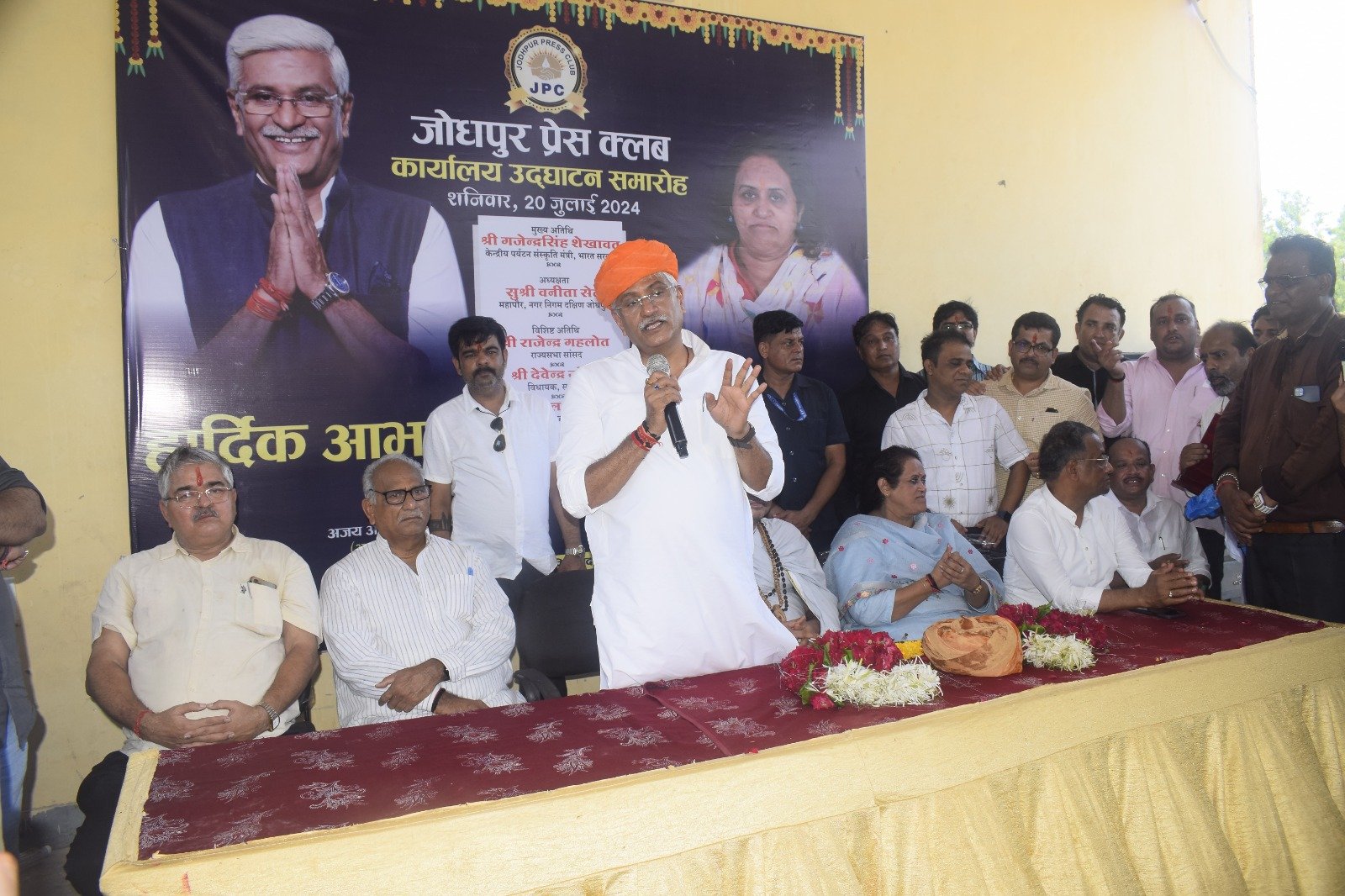 जोधपुर। सरदारपुरा स्थित गांधी मैदान में जोधपुर प्रेस क्लब कार्यालय का शनिवार को विधिवत उद्घाटन किया गया। महंत रामप्रासाद महाराज के सानिध्य में केंद्रीय पर्यटन व संस्कृति मंत्री गजेंद्र सिंह शेखावत, राज्यसभा सांसद राजेंद्र गहलोत, सूरसागर विधायक देवेंद्र जोशी, नगर निगम दक्षिण की महापौर सुश्री वनिता सेठ व भाजपा जिलाध्यक्ष देवेंद्र सालेचा ने फीता काटकर कार्यालय का विधिवत उद्घाटन किया। वैदिक मंत्रोच्चार के साथ गणपति पूजन किया गया। इसके बाद अतिथियों का सम्मान समारोह आयोजित हुआ। इस अवसर पर ढोल थाली बजाने के साथ ही शानदार आतिशबाजी भी की गई। इस अवसर पर केंद्रीय पर्यटन व संस्कृति मंत्री गजेंद्र सिंह शेखावत ने कहा कि पत्रकार समाज का आईना होते हैं। लंबे समय से पत्रकारों की माँग आज पूरी हुई है। उन्होंने कहा कि अन्य माँगो पर भी जल्द ही सकारात्मक कारवाई होगी। सांसद राजेंद्र गहलोत व सूरसागर विधायक देवेंद्र जोशी ने कहा कि पत्रकारों की हर माँग को लेकर सरकार संवेदनशील है।