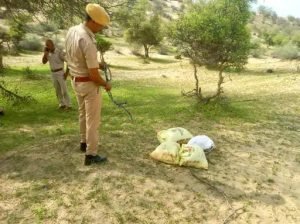 जैसलमेर(सी आर देवपाल म्याजलार)। जिले के म्याजलार गांव के पास गुरुवार को एक जिंदा हैंड ग्रेनेड मिलने से सनसनी फैल गई। म्याजलार गांव की हुकम सिंह की ढाणी से करीब 1 किमी दूर सुनसान इलाके में एक चरवाहे को हैंड ग्रेनेड दिखा। उसने ग्रामीणों को इसकी जानकारी दी।म्याजलार पुलिस को सूचना मिलने पर बी एस एफ के अधिकारियों को साथ लेकर मौके पर पहुंची।म्याजलार थाना प्रभारी नरेंद्र सिंह ने बताया कि हैंड ग्रेनेड रेत में आधा दबा हुआ है। हाल ही में आई बारिश की वजह से मिट्टी हटने से बम बाहर आ गया है। हमने बम को सुरक्षित रखकर उसको मिट्टी के कट्टों से कवर कर दिया है। साथ ही एक पुलिसकर्मी की ड्यूटी भी वहां लगा दी है, ताकि कोई इसे छूए ना या इसे छेड़े ना। इसकी जानकारी नहीं मिल पाई कि ये यहां कैसे आया। संभवतया किसी युद्धाभ्यास के दौरान ये यहां छूट गया होगा। थाना प्रभारी ने बताया कि हमने बम की सूचना उच्चाधिकारियों को बता दी है। अब भारतीय सेना के बम निरोधक दस्ते को यहां बुलाया जाएगा और वो इसे डिफ्यूज करने का काम करेंगे।