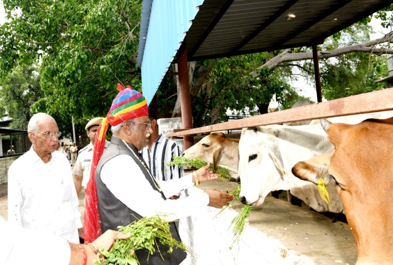 जोधपुर। राज्यपाल हरिभाऊ बागडे ने जन्माष्टमी के अवसर पर श्री कन्हैया गौशाला पहुंचकर वहां भगवान श्री कृष्ण की विधिवत पूजा अर्चना की। उन्होंने बाद में गौशाला में गाय का पूजन कर नन्हे बछड़े का दुलार भी किया। उन्होंने गायों को हरा चारा भी खिलाया। गौशाला का अवलोकन करते हुए उन्होंने गौधन संरक्षण के साथ गौ उत्पादों के प्रभावी विपणन की रणनीति पर कार्य करने पर भी जोर दिया। उन्होंने कन्हैया गौशाला की व्यवस्थाओं, प्रबंधन और गौधन संरक्षण के लिए किए जा रहे कार्यों की सराहना की।