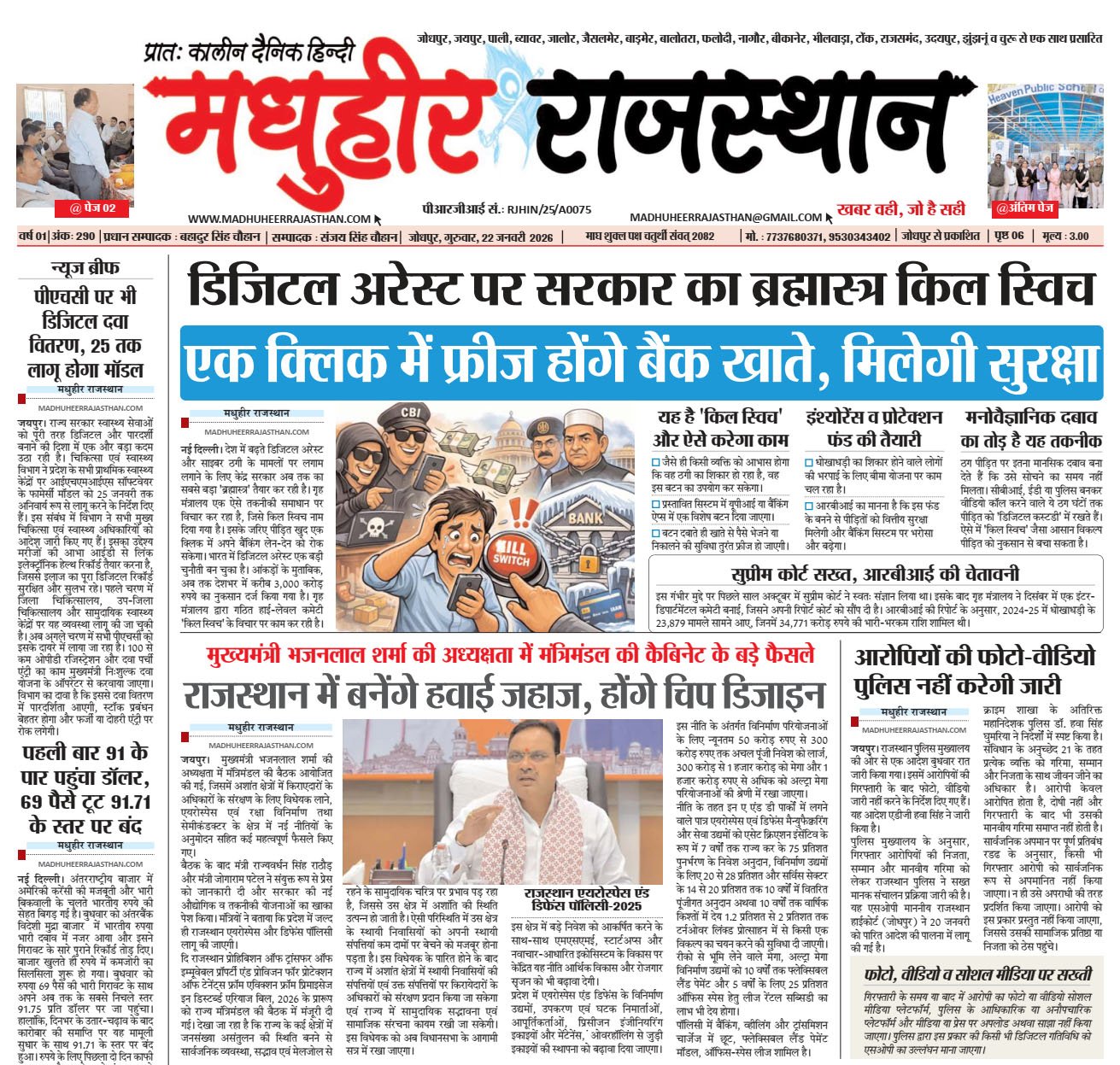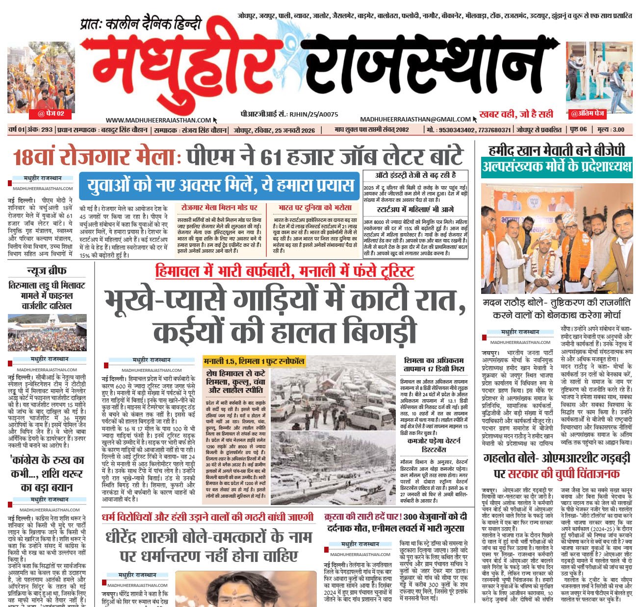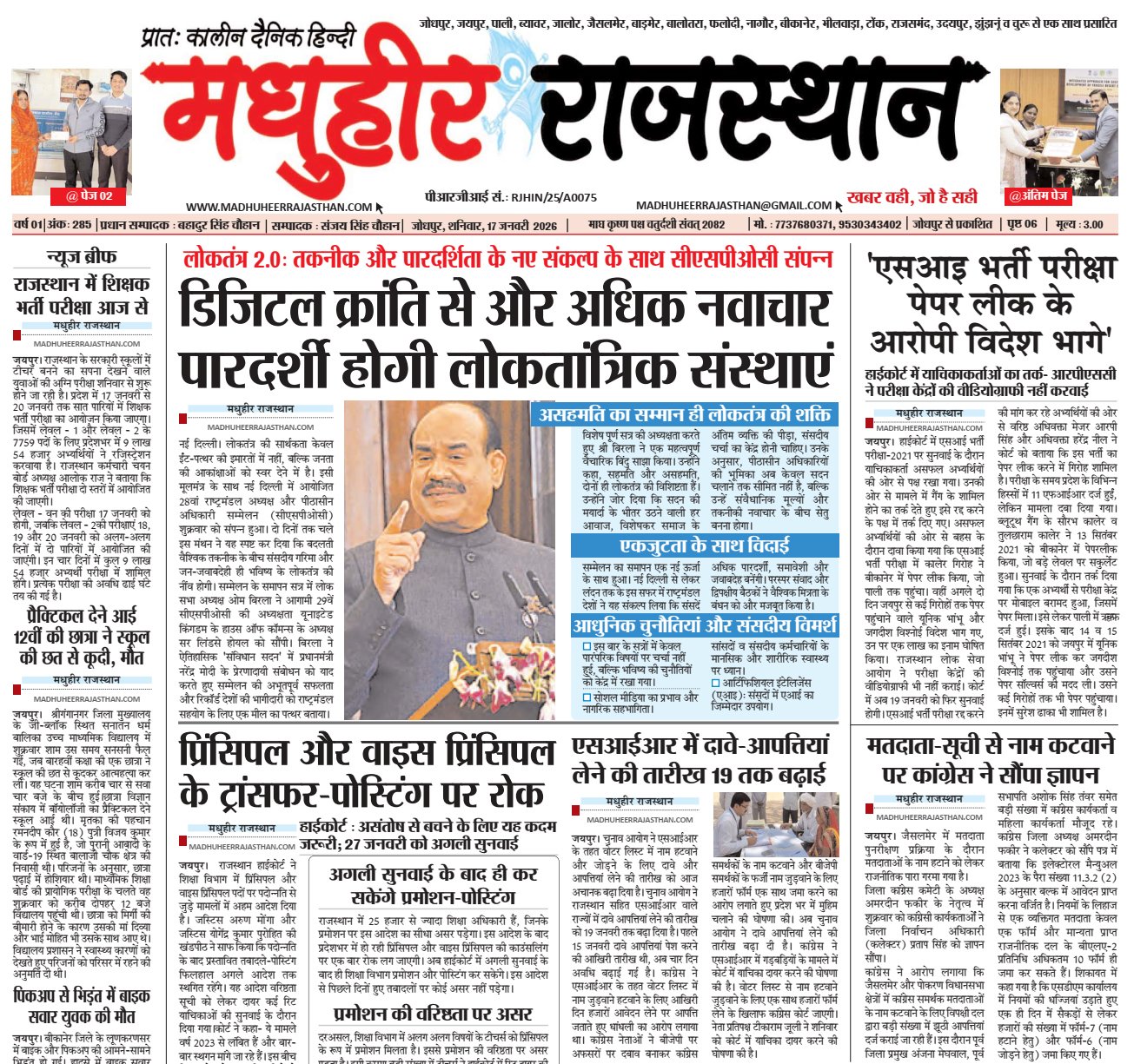 शहीद दिवस पर समाजसेवियों का सम्मान, सोनिया शर्मा को मिला विशेष सम्मान शयान खान ने 10वीं में 95% अंक हासिल कर बढ़ाया परिवार और स्कूल का मान धवा गांव में अदा हुई ईद की नमाज, अमन-चैन और भाईचारे का दिया संदेश  वीर बिरसा मुंडा अंतरराष्ट्रीय रक्तदाता सम्मान समारोह 2026 में समाजसेवी सोनिया शर्मा सम्मानित जोधपुर में 17 मार्च को कई क्षेत्रों में जलापूर्ति बंद, 18 व 19 मार्च को बदलेगा सप्लाई शेड्यूल सीआईआई राजस्थान वार्षिक सम्मेलन : “युवाओं को उद्यमी और रोजगार देने वाला बनने के लिए प्रोत्साहित करें ”: मुख्यमंत्री भजन लाल शर्मा