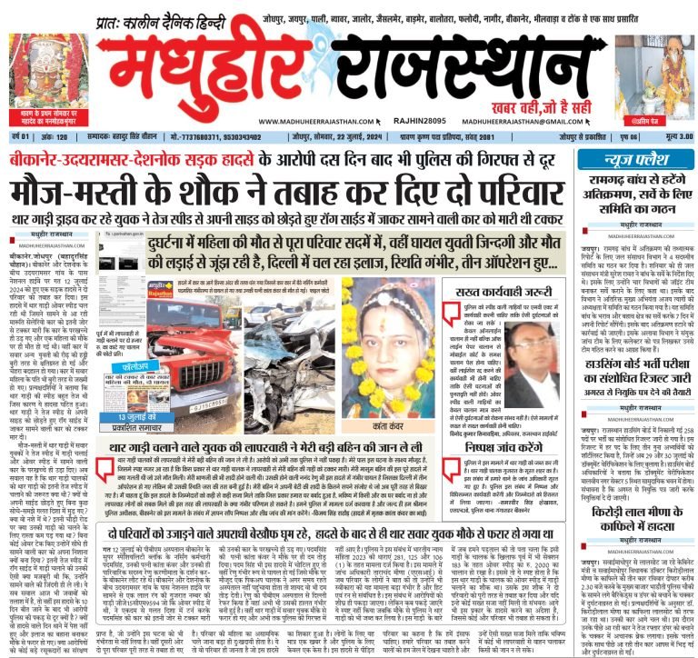 2,788 Views दस दिन बाद भी गुनहगार पुलिस की पकड़ से दूर दुघर्टना में महिला की मौत से पूरा परिवार सदमें में, वहीं घायल युवती जिन्दगी और मौत की लड़ाई से जूंझ रही है, दिल्ली में चल रहा इलाज, स्थिति गंभीर, तीन ऑपरेशन हुए मधुहीर राजस्थान बहादुर सिंह चौहान (7737680371) बीकानेर। बीकानेर और देशनोक के…